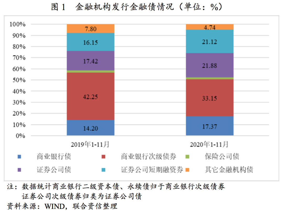 2020年商業銀行和證券公司債券發行量占金融債發行總量90%左右,證券公司債券融資規模占比有所上升。