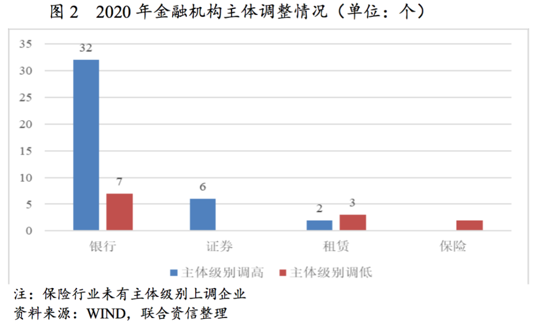 ?2020年商業銀行和證券公司債券發行量占金融債發行總量90%左右,證券公司債券融資規模占比有所上升;金融機構主體級別上調主要多為股東增資或企業股東背景發生實質性向好變化,級別下調主要多為股東結構混亂導致經營出現困難、資產質量惡化。
