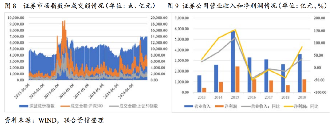 證券公司經營表現與證券市場關系緊密,隨著市場下行和成交量的低迷,全行業證券公司營業收入和凈利潤自2015年開始連續三年下滑;2016-2018年,全行業證券公司營業收入均有所下滑,三年同比下滑42.97%、5.08%和14.47%,凈利潤分別同比下滑49.57%、8.47%和41.04%。2019年證券市場交易額的回升證券公司全年實現營業收入3604.83億元,凈利潤1230.95億元,分別較2018年增長35.37%和84.77%。