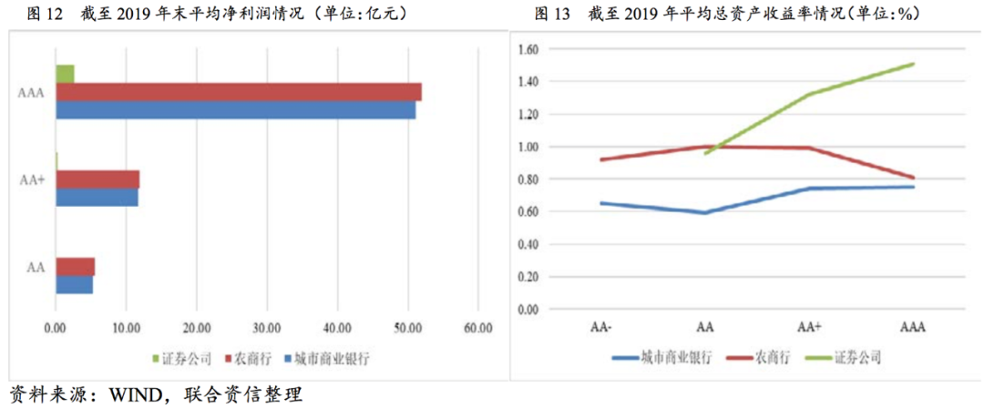 ?國有商業銀行和股份制商業銀行規模效應顯著。同主體信用級別下,城商行、農商行資產規模和凈利潤規模明顯優于證券公司;所有者權益方面,AAA主體信用級別證券公司與城商行、農商行差距較小,且AA+~AAA級證券公司ROA水平高于城商行、農商行。