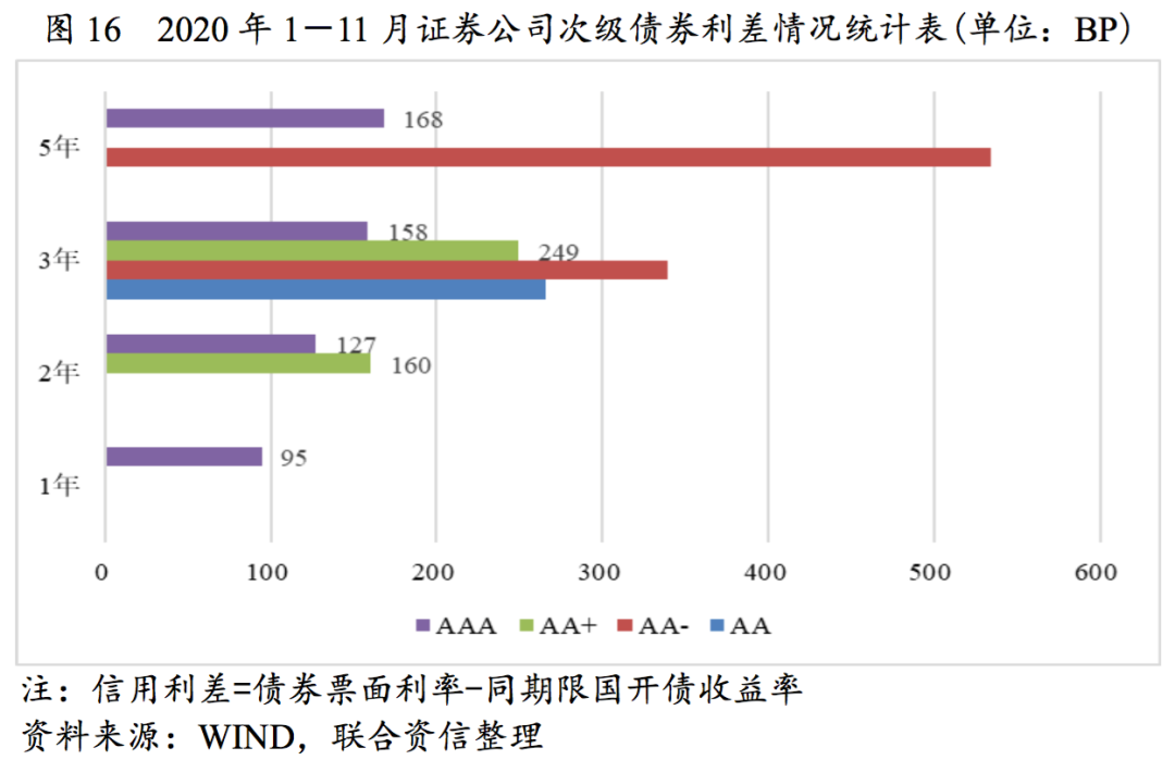 2020年1-11月,證券公司次級債發行期限1~5年,1年期次級債均為主體信用級別AAA級證券公司發行。兩年期次級債券AAA級證券公司信用利差低于AA+級33BP,3年期次級債券AAA級信用利差低于AA+級別91BP。5年期AA-主體信用級別樣本較少,個體差異化影響較大。通過商業銀行和證券公司發行次級債券信用利差對比,國有商業銀行和股份制商業銀行信用利差最低,商業銀行信用級別之間的利差低于證券公司,但5年期AAA級證券公司次級債券信用利差低于AAA級城商行和農商行分別為8BP和28BP。