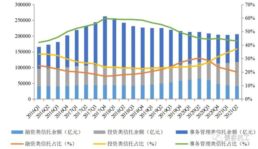 2021年8月18日,中國信托業協會公布了2021年2季度末主要信托業務數據,其中信托資產規模為20.64萬億元,相比1季度末增加了0.26萬億元,結束了連續13個季度的下降。單純從業務規模來看,信托資產規模的增加似乎看起來是非標融資回暖的跡象,但是如果對信托資產的構成進行拆分分析,就會發現,非標融資增加還是成為了幻影: