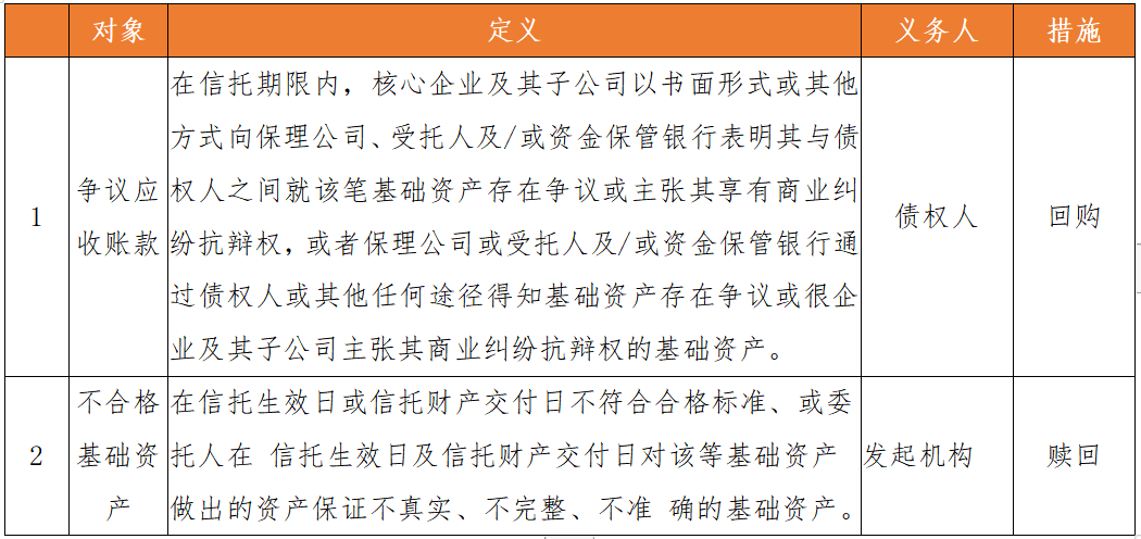 供應鏈ABN項目一般不設循環購買、不設計次級證券或設置次級證券但是由發起機構自持不分配期間收益,基礎資產直接回款至信托計劃保管賬戶,因此,上述信用觸發事件對供應鏈ABN并不適用。