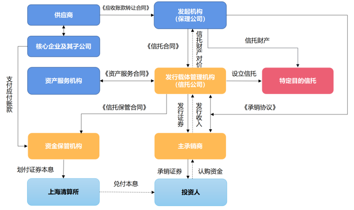 1、該等應收賬款債權系指基礎交易的賣方/承包人/出租人(以下簡稱“債權人”)與基礎交易的的買方/工程發包方/承租人(以下簡稱“債務人”)訂立的有關境內貨物貿易和服務貿易、工程建設、租賃等合同性法律文件,基礎交易的債權人對基礎交易的債務人享有的請求支付對應價款的權利。該應收賬款債權為整個資產支持票據的基礎債權。 (1)轉讓一手的情形,鐵建下屬成員單位作為基礎交易的債務人,與基礎交易的債權人發生貨物/服務貿易、工程承包、租賃業務等交易,對后者負有支付價款的義務,將該應付賬款在鐵建供應鏈金融服務平臺為其開具銀信。 (2)轉讓2-N手的情形,鐵建下屬成員單位對基礎交易的債權人負有應付賬款(該應付賬款金額與所開具銀信金額一致),并與基礎交易的債務人共同在中國鐵建供應鏈金融服務平臺上申請將該應付賬款以應付賬款-應收賬款債權的形式開具給基礎交易的債務人。基礎交易的債權人持有銀信后,將該銀信轉讓給基礎交易的債務人,作為貨物/服務貿易、工程承包、租賃業務等基礎交易的價款支付的對價。 3、銀信持有人將該銀信直接轉讓給鐵建保理申請融資,或轉讓給其他銀信受讓人,經過2-N手轉讓,最終持有銀信憑證的銀信持有人作為融資人,將其所持有的應收賬款債權轉讓給鐵建保理,并與鐵建保理簽署《銀信商業保理融資協議》,鐵建保理合法合規受讓該等應收賬款債權。 4、鐵建保理將該應收賬款債權信托/轉讓給上海信托設立中鐵建商業保理2018年度第一期銀信供應鏈資產支持票據信托并發行支持支持票據。 |