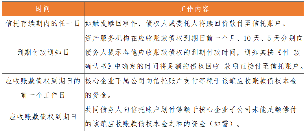 在供應鏈ABN中,由于債務人均為核心子公司(少部分應收賬款債務人可能為核心企業本身),改變現金流回款路徑也容易的多,因此不再設置資金監管賬戶,由債務人于應收賬款到期日直接將資金支付至信托計劃賬戶。