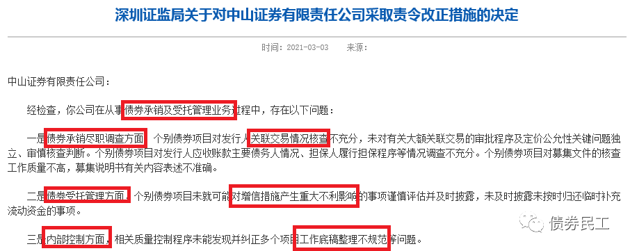 根據深圳證監局2021年3月3日在官網公開的《關于對中山證券有限責任公司采取責令改正措施的決定》,中山證券因在債券承銷及受托管理業務中存在盡職調查、受托管理和內部控制等三個方面的問題,被采取責令改正的監督管理措施。