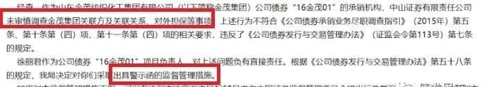 2、2020年11月30日,因山東金茂紡織化工集團有限公司(以下簡稱金茂集團)公司債券“16金茂01”的承銷工作中“未審慎調查金茂集團關聯方及關聯關系、對外擔保等事項”,山東證監局對中山證券出具警示函措施的決定。
