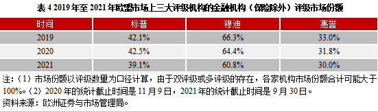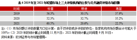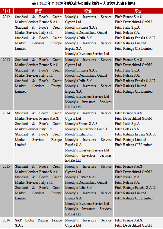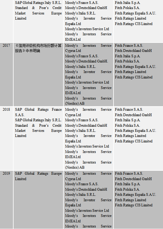 對于標普而言,旗下的S&P Global Ratings Europe Limited于2018年5月1日合并了S&P Global Ratings Italy S.r.l.,于2018年6月30日合并了Standard and Poor’s Credit Market Services Europe Limited,于2018年7月31日合并了S&P Global Ratings France S.A.S.。所以,2019年納入市場份額計算的標普旗下機構僅為S&P Global Ratings Europe Limited,該機構是一家總部位于都柏林的愛爾蘭公司。