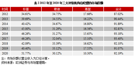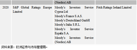 對于惠譽而言,Fitch Ratings Ireland Limited于2020年5月30日合并了Fitch Deutschland GmbH,于2020年5月31日合并了Fitch France S.A.S.、Ftich Polska S.A.以及Ftich Italia S.p.A.,于2020年11月30日合并了Fitch Ratings Espa?a S.A.U.。另外,位于英國的Fitch Ratings Limited和Fitch Ratings CIS Limited于2021年1月1日注銷注冊。2020年納入市場份額計算的惠譽旗下機構僅為Fitch Ratings Ireland Limited。