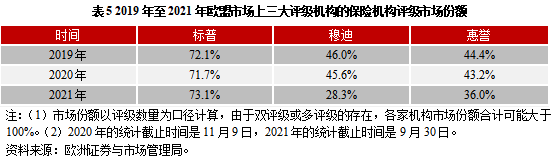 第二,根據2021年5月7日ESMA發布的歐盟注冊信用評級機構名單,標普和惠譽分別僅保留一家注冊評級機構在此份名單內,總部均設在愛爾蘭,而穆迪在注冊機構名單內仍有六家,從接受監管所需付出成本的角度來看,保留多家注冊機構將意味著更多的成本。