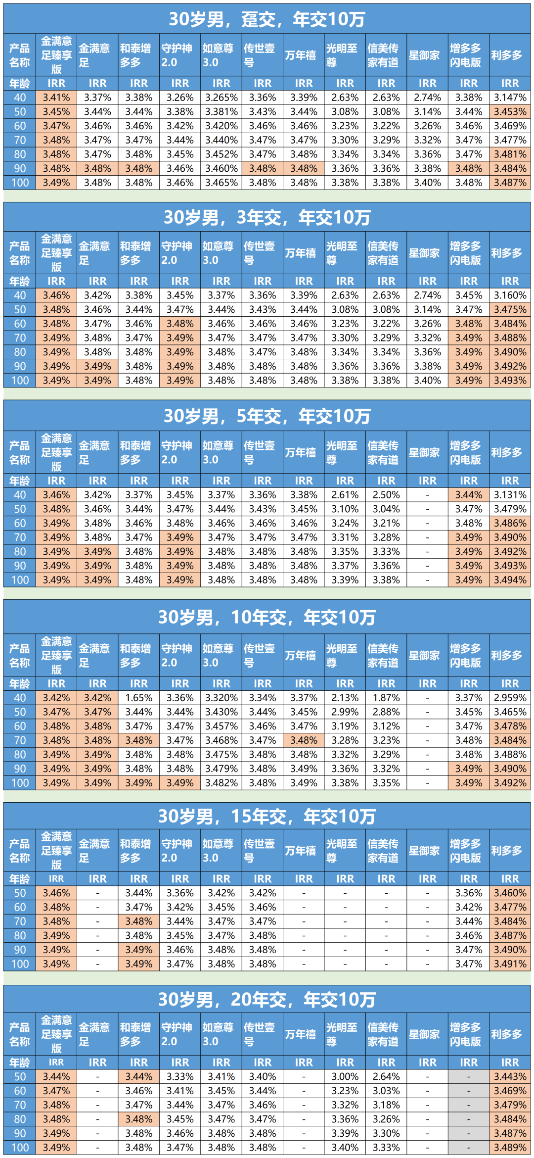 如果是10年、15年、20年交,表現(xiàn)較好的是金滿(mǎn)意足增額壽險(xiǎn)、守護(hù)神2.0、如意尊3.0。