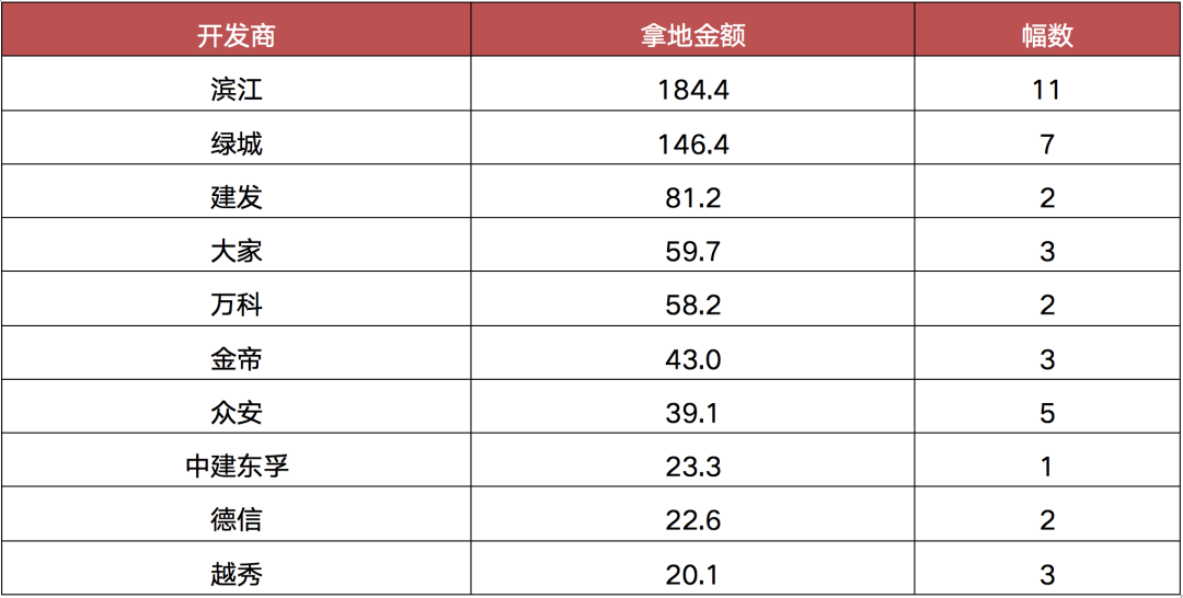 從房企拿地來(lái)看,本土民企表現(xiàn)活躍,尤其是濱江成為最大贏家,本輪拿下11幅地塊,拿地金額超過(guò)180億元,而綠城則緊隨其后。外來(lái)房企仍然以資金實(shí)力充沛的央企和國(guó)企為主,比如如大悅城、保利、招商、越秀、華潤(rùn)、中鐵建、建發(fā)等均積極參拍