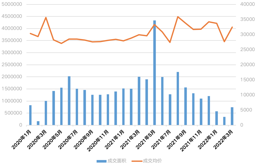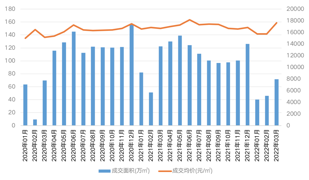圖:2020年1月-2022年3月杭州商品住宅成交量?jī)r(jià)(萬(wàn)平方米、元/平方米)