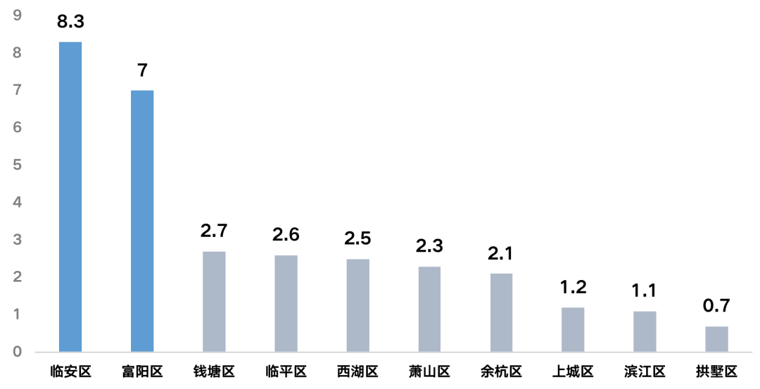 從去化來(lái)看,雖全市商品住宅去化僅為4.2個(gè)月,但臨安、富陽(yáng)區(qū)的商品住宅去化周期顯著高于其他區(qū)域,分別為8.3個(gè)月和7個(gè)月。