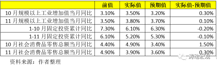 2、11月的工業生產與消費實際值較預期值亦呈現改善態勢。具體看,11月規模以上工業增加值當月同比增速為3.80%、較預期值高出0.10個百分點,11月社會消費品零售總額當月同比增速為3.90%、較預期值高出0.30個百分點。