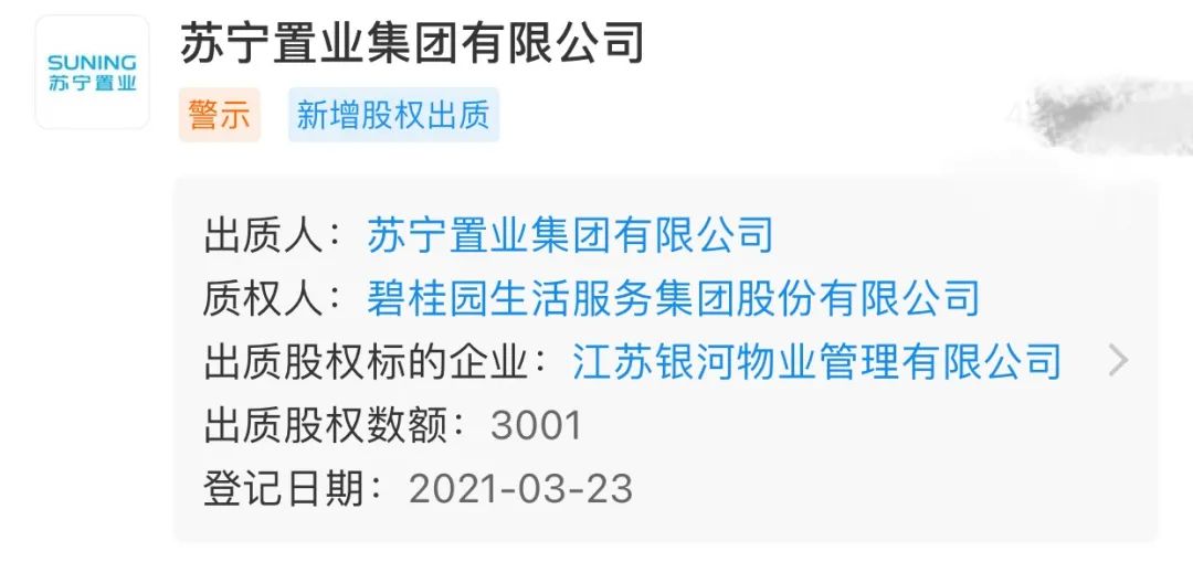 最新資料顯示,蘇寧置業(yè)將其所持江蘇銀行物業(yè)管理有限公司的全部股份,質(zhì)押給了碧桂園生活服務(wù)集團(tuán),后者是碧桂園服務(wù)(06098.HK)在內(nèi)地的主要運(yùn)營(yíng)平臺(tái)公司。