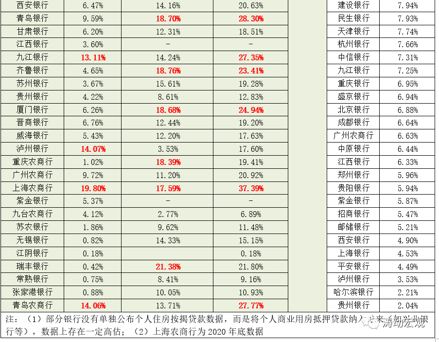 1、從今年上半年的數據來看,全國性銀行的個人住房貸款占比普遍較高,部分地方性銀行的房地產業貸款(對公)占比較高。當然也有一些地方性銀行的個人住房貸款占比較高,如徽商銀行、中原銀行、成都銀行、青島銀行、齊魯銀行、廈門銀行、重慶農商行、上海農商行以及瑞豐銀行等。