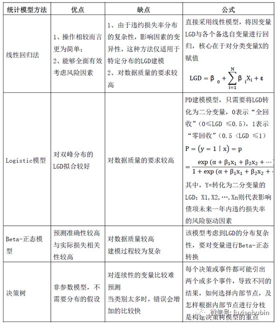 最后則是設(shè)計(jì)、建立統(tǒng)計(jì)模型,并給予實(shí)際業(yè)務(wù)經(jīng)驗(yàn)對模型及其估值參數(shù)進(jìn)行調(diào)整,進(jìn)而彌補(bǔ)不完善的數(shù)據(jù),使模型的參數(shù)更加符合實(shí)際業(yè)務(wù)經(jīng)驗(yàn)。最終通過LGD值與債項(xiàng)等級的映射,構(gòu)建債項(xiàng)評級體系。根據(jù)金融機(jī)構(gòu)的業(yè)務(wù)特色,金融機(jī)構(gòu)可結(jié)合各自的資源稟賦和各個統(tǒng)計(jì)模型的優(yōu)缺點(diǎn),從中篩選適合自身的統(tǒng)計(jì)模型(統(tǒng)計(jì)模型方法如下表):