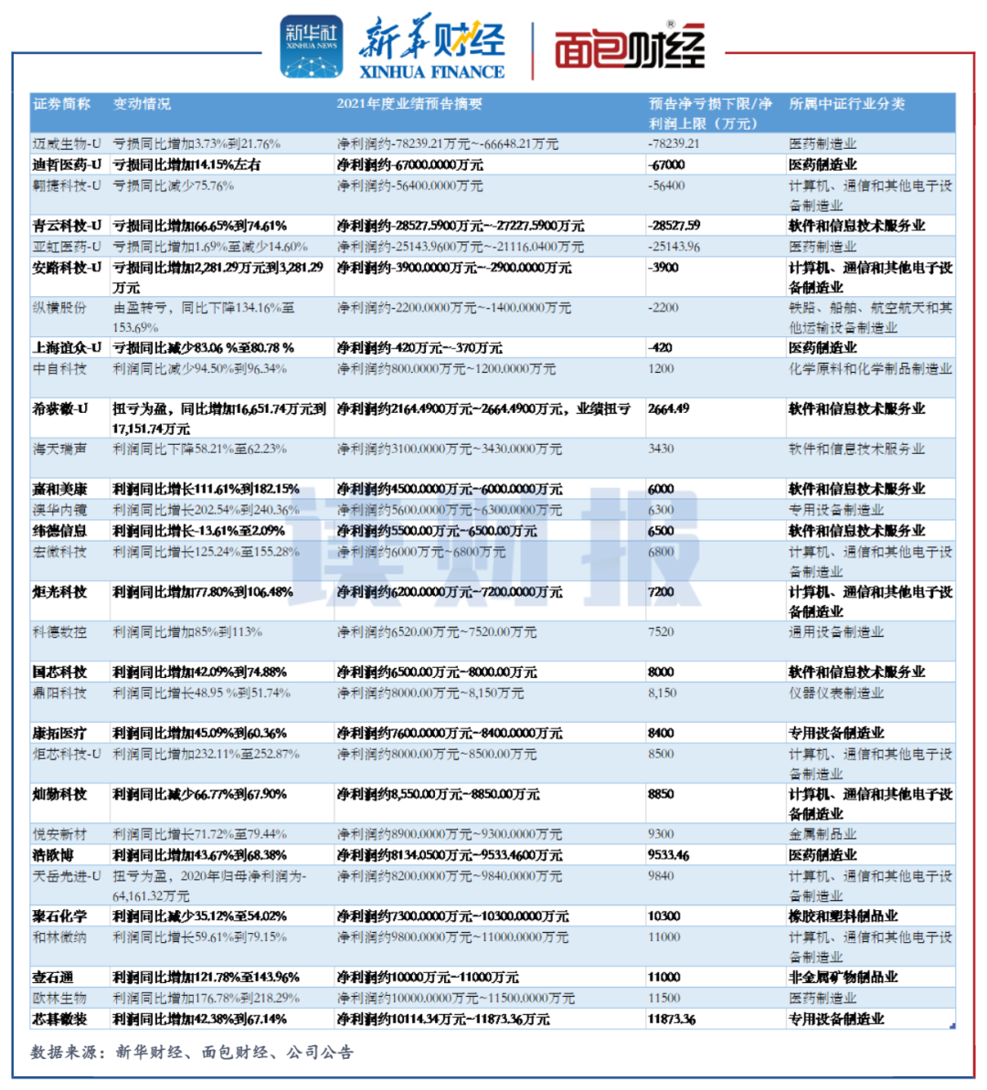 根據各家公司2021年的業績預告,合計134家上市公司預告歸母凈利潤為正,其中117家公司預告較上年同期增加。按凈利潤的上限做統計,在預盈金額最低的20家公司中,芯原股份-U、艾力斯-U、三生國健、希荻微-U和百奧泰-U實現扭虧為盈。