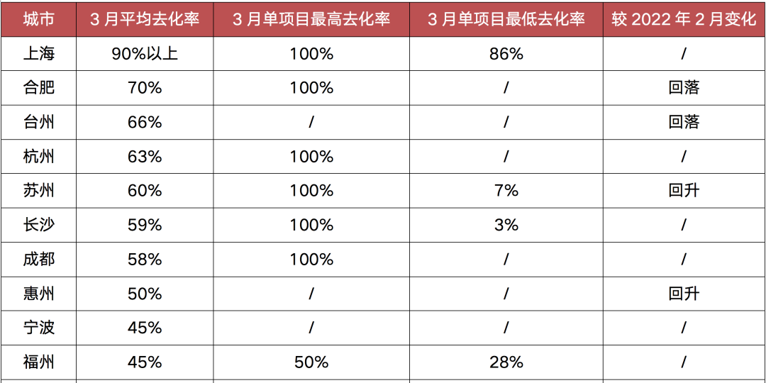 項(xiàng)目去化高于平均值的城市有14個(gè),但開(kāi)盤去化率超六成的城市只有5個(gè)。此外,3月開(kāi)盤去化率較2月回落的城市共有8個(gè),只有5個(gè)城市開(kāi)盤去化率有所回升。