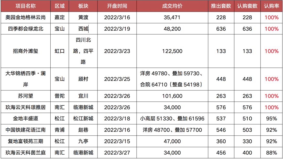 表:上海2022年3月部分開(kāi)盤項(xiàng)目認(rèn)購(gòu)情況(單位:元/平方米,套)