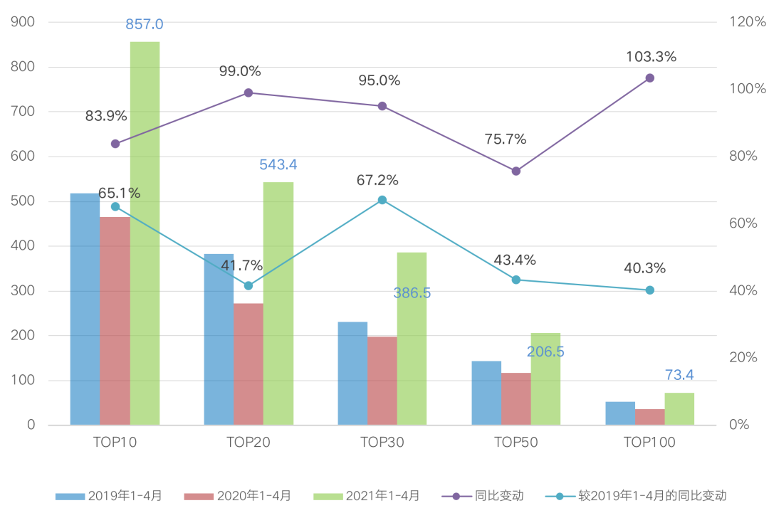 2021年1-4月,各梯隊(duì)房企銷售門檻繼續(xù)提升,相較去年和2019年同期均有明顯增幅。其中,TOP10房企銷售操盤金額門檻為857億元,較2019年同期增長65.1%,龍頭房企保持規(guī)模優(yōu)勢。
