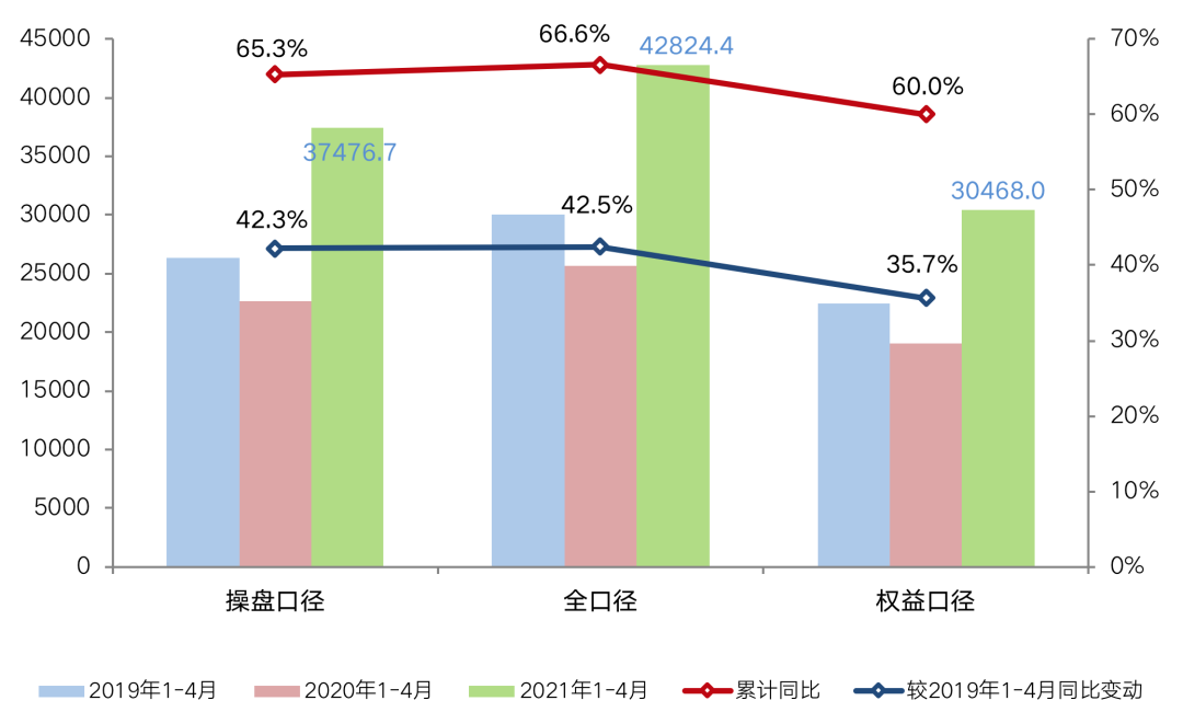 從前4月累計(jì)銷售操盤金額來看,1-4月,百強(qiáng)房企整體的業(yè)績規(guī)模同比增長65.3%,較2019年同期也增長近42.3%。1-4月百強(qiáng)房企全口徑銷售金額更是達(dá)到了42824.4億元,同比增長66.6%。