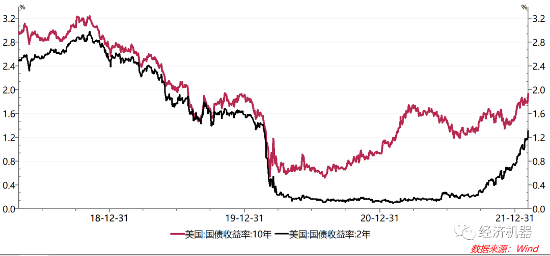 圖1、美國國債收益率:2年期 vs 10年期
