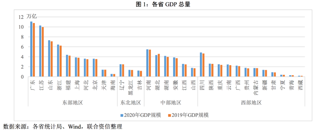?GDP總量在經(jīng)濟(jì)相對(duì)發(fā)達(dá)地區(qū)和欠發(fā)達(dá)地區(qū)的分化較為明顯,東部地區(qū)繼續(xù)維持領(lǐng)跑態(tài)勢(shì);2020年,除湖北以外,其余30個(gè)省份GDP增速全部轉(zhuǎn)正,中西部地區(qū)增速分化更為明顯,東北地區(qū)經(jīng)濟(jì)恢復(fù)相對(duì)較慢,東部地區(qū)則相對(duì)較為均衡。