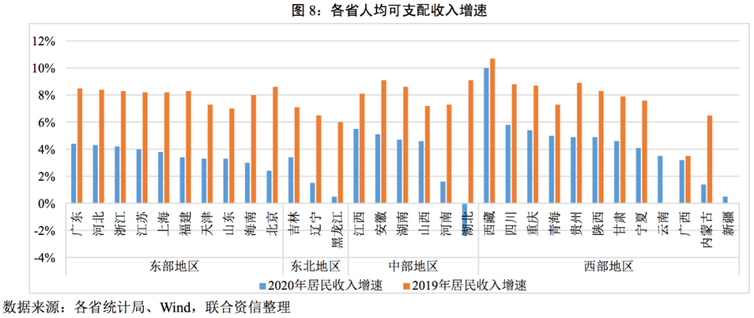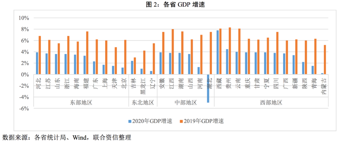 從GDP增速看,2020年除湖北以外,其余省份增速全部為正,其中西藏以7.80%的增速領(lǐng)跑全國,主要是其受疫情沖擊較小;貴州以4.46%的增速連續(xù)第四年位列第二。整體看,有20個(gè)省份的GDP增速超過全國。分區(qū)域看,東部地區(qū)增速相對(duì)較為平穩(wěn),中部和西部地區(qū)GDP增速分化更為明顯,東北地區(qū)經(jīng)濟(jì)增速相對(duì)較低。