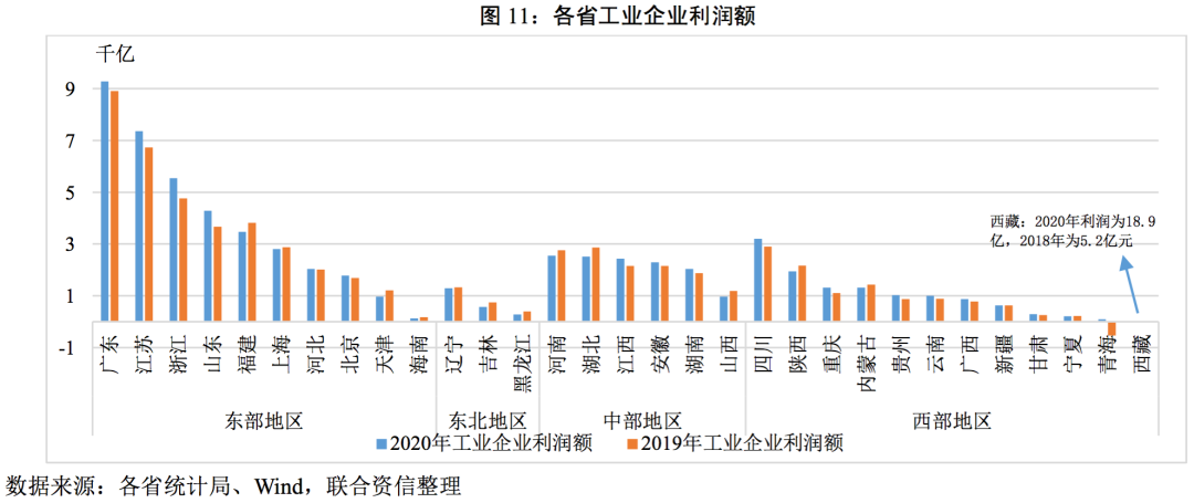 從企業(yè)利潤(rùn)增速看,2020年工業(yè)利潤(rùn)增速最大值與最小值差距為44.30%(2019年為42.1%),地區(qū)間的差異較2019年進(jìn)一步加大。有15個(gè)省份工業(yè)企業(yè)利潤(rùn)為負(fù)增長(zhǎng),較2019年減少3個(gè)省份;17個(gè)省份工業(yè)企業(yè)利潤(rùn)增速超過2019年。分區(qū)域看,東部、西部和中部地區(qū)各省份分化均較為明顯,且有進(jìn)一步加劇的趨勢(shì),東北地區(qū)三省全部負(fù)增長(zhǎng),主要是因?yàn)?020年國際大宗商品價(jià)格不景氣在一定程度上壓縮黑色金屬以及石油開采及加工行業(yè)的利潤(rùn)。