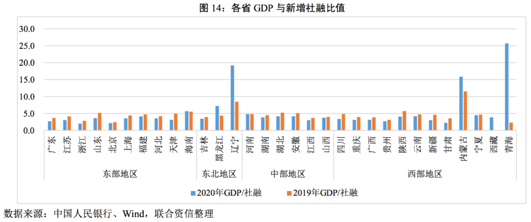 GDP與新增社融的比值可以衡量各省份的資本使用效率。從各省的數(shù)據(jù)看,大部分省份的資金并未有效拉動(dòng)GDP的增長(zhǎng),如廣東、江蘇、浙江、山東等融資大省,資金使用效率較低,且與2019年相比進(jìn)一步降低,與之相反的是,遼寧、內(nèi)蒙古、青海等經(jīng)濟(jì)規(guī)模較小的省份,資金使用效率較高,主要是由于這些地區(qū)的政府債券融資比重較大且經(jīng)濟(jì)規(guī)模較小,因此對(duì)經(jīng)濟(jì)的拉動(dòng)效應(yīng)較為明顯。