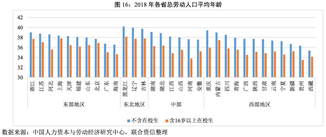 從勞動(dòng)力人口來說,報(bào)告測(cè)算的數(shù)據(jù)顯示,1985-2018年間,全國勞動(dòng)力人口(包括學(xué)生)的平均年齡從32.2歲上升到了38.4歲。平均年齡最高的前五個(gè)省份是黑龍江、遼寧、吉林、重慶、湖南;平均年齡最低的五個(gè)省份是廣東、新疆、海南、貴州、西藏。勞動(dòng)人口的年齡分布基本與人口流動(dòng)相一致,北京、上海等老齡化已逐步抬頭的較發(fā)達(dá)城市,得益于勞動(dòng)力涌入而在該指標(biāo)中排名中等;東北三省多年以來的人口流出使得該地區(qū)的勞動(dòng)人口平均年齡顯著高于其他地區(qū)。