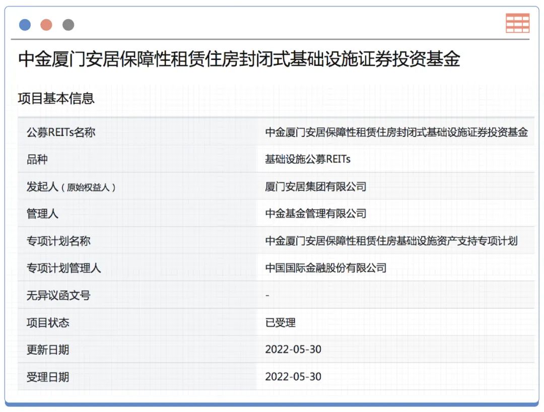 2022年5月27日,中金廈門安居保障性租賃住房、紅土創(chuàng)新深圳人才安居保障性租賃住房兩只REITs分別于上交所、深交所和證監(jiān)會報送申請材料,成為首批上報的兩單保障性租賃住房REITs。這是保租房自去年6月納入基礎(chǔ)設(shè)施REITs發(fā)行范圍以來,取得的突破性進展。
