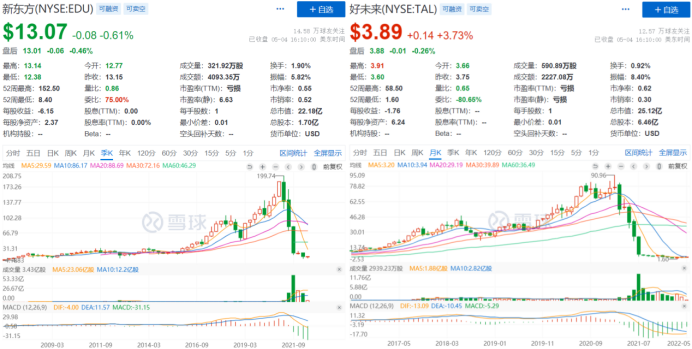 從股價上來看,新東方距最高點199.74美元每股已跌至13.07美元每股,跌幅高達93.4%;好未來距最高點90.96美元每股已跌至3.89美元每股,跌幅高達96%。