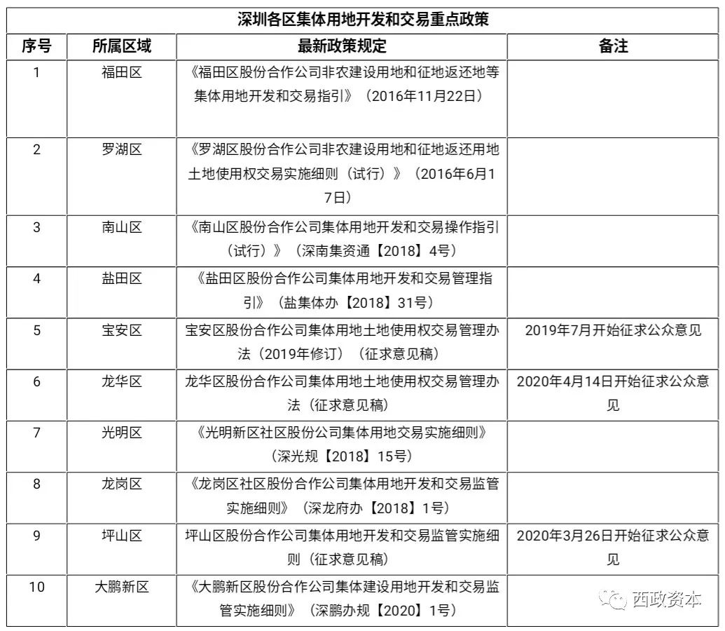通過閱讀各區關于集體用地開發和交易管理的相關規定(詳見附表:深圳各區集體用地開發和交易重點政策),各區對于非農建設用地/征地返還用地項目在具體合作方的選取與集資資產備案審批上,規定還是各不相同,具體還是以各區具體規定為準。