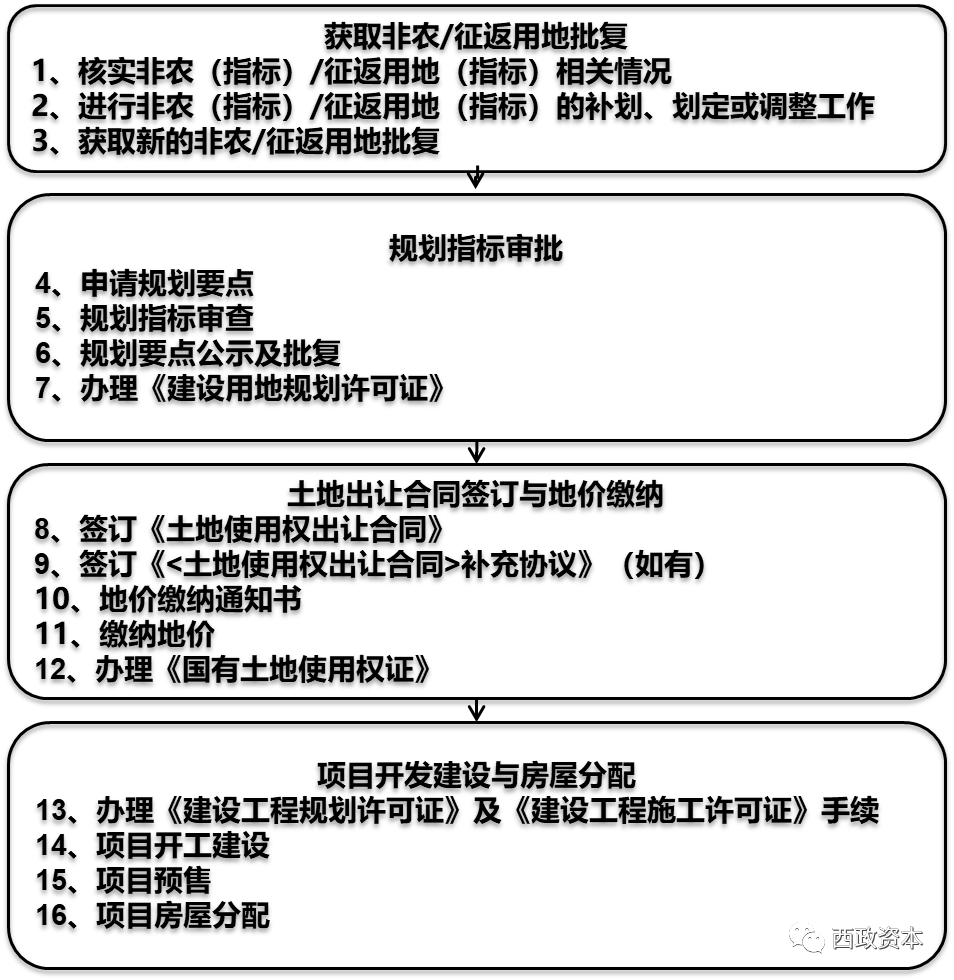 非農建設用地/征地返還用地項目的具體操作流程上,一般均需經歷如下流程:
