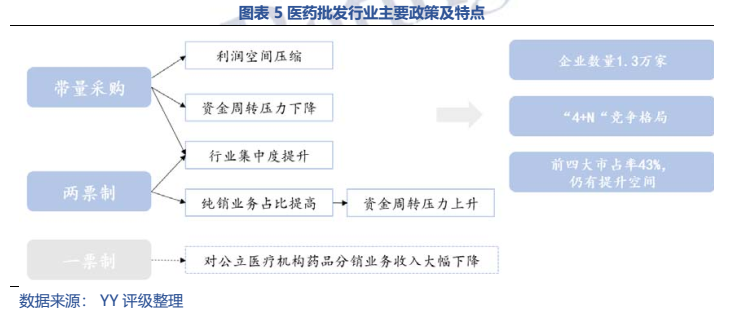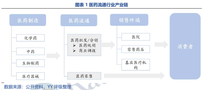 本文從產業鏈、行業規模及增速、相關政策、競爭格局等角度對醫藥流通行業基本面進行了梳理,主要觀點如下:1)醫藥流通企業整體議價能力較弱;2)醫藥批發行業“4+N”競爭格局基本形成,前四大(國藥控股、上海醫藥、華潤醫藥、九州通)市占率43%,仍有提升空間;3)醫藥零售行業增速高于行業整體,行業地位靠前的企業有國大藥房、大參林、老百姓、益豐藥房、一心堂、同仁堂等,集中度仍處于較低水平,且連鎖藥店跨區域擴張難題影響集中度提升。