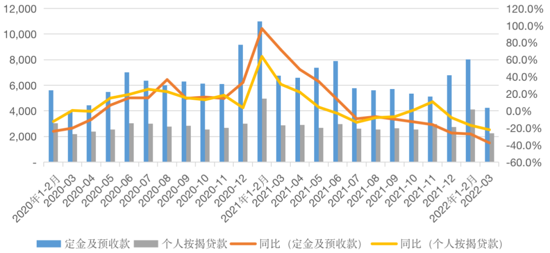 圖:2020年以來房地產到位資金(定金及預收款)、(個人按揭貸款)當月值及同比(單位:億元,%)