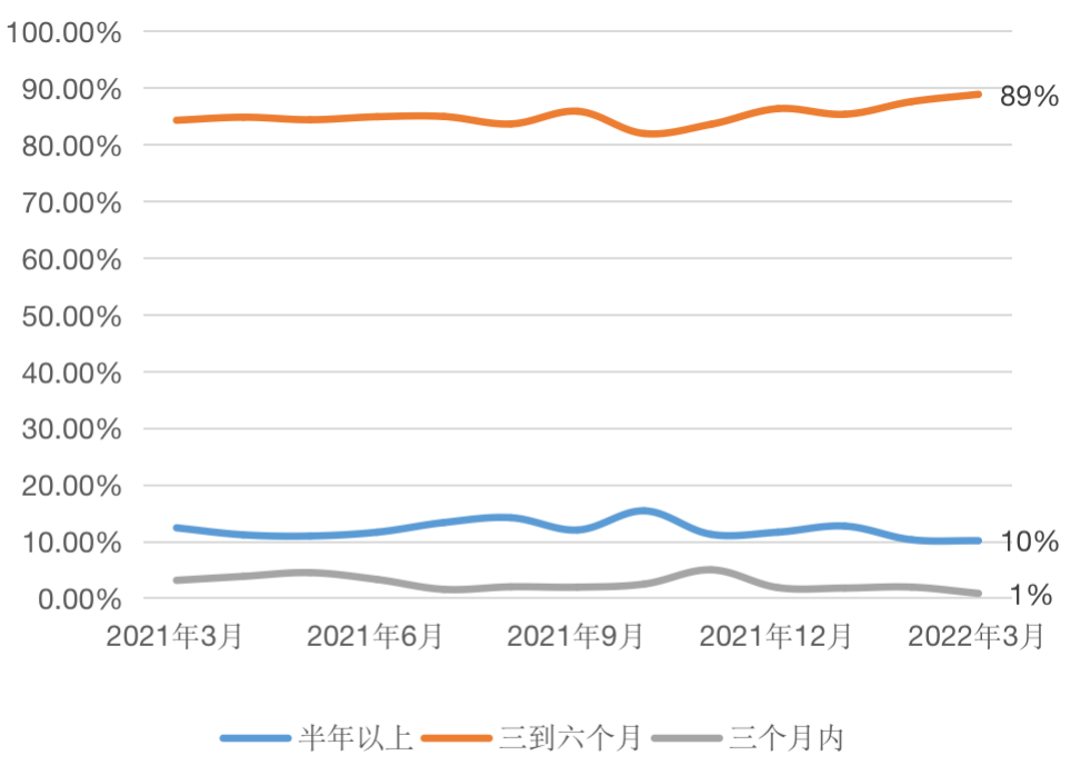 2022年3月,購房者信心尚未恢復。根據CRIC客戶調研數據顯示,計劃三個月內買房的客戶比例降至1%,而三到六個月內購房需求有所提振,但受困于疫情形勢越發嚴峻,市場熱度尚未回溫。