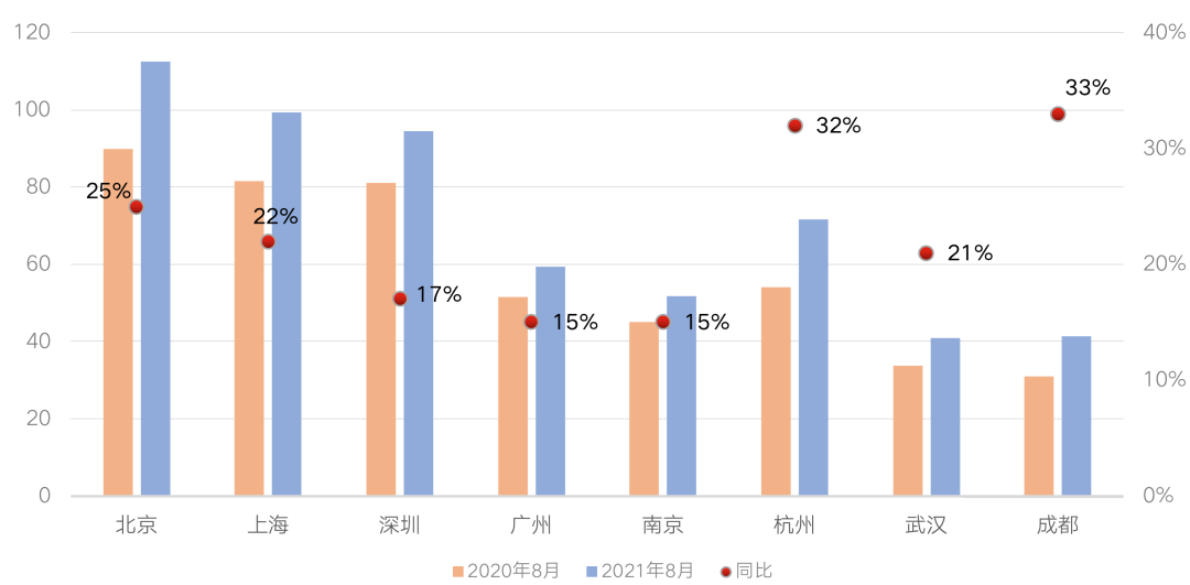 8月,核心八城租金水平較7月有所下降,平均租金為71.4元/平米/月,環比微降2.3%,但相較于2020年同期仍有22%的漲幅,但各城市租金漲幅增速有所放緩,其中成都同比增長33%,較7月同比增速下降7個百分點。