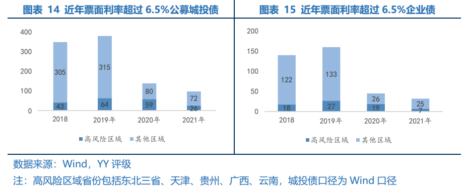 票面利率為6.80%的企業債在目前環境下且買且珍惜。“21興蒲專項債”票面利率為6.80%,高于發行當日AAA級5年期中債中短期票據到期收益率304BP,絕對收益和相對收益都較高,能滿足多數機構對收益率的要求。再考慮到目前監管嚴控城投債務的決心,從2020年3月鹽城清退收益8%以上的非標融資、2021年年初“紅橙黃綠”新政策的執行、以成本更低的地方債替代城投債,市場上高收益的城投非標和標債供給逐漸減少。公募城投債是城投信仰的最后一道防線,高收益公募城投債在一定程度上兼顧了違約風險和收益。近年票面利率超過6.5%的公募城投債和企業債數量急劇下降,同時考慮到高風險區域部分機構不能入庫,高收益公募城投債更少。票面利率達6.80%的“21興蒲專項債”在目前的市場環境下,顯得有些突兀,但是如果站在利差和時間走勢角度而言,這個收益率可能市場很多機構難以入庫,但是其另一面的收益面,可能也提供了一些風險抵御的思路。