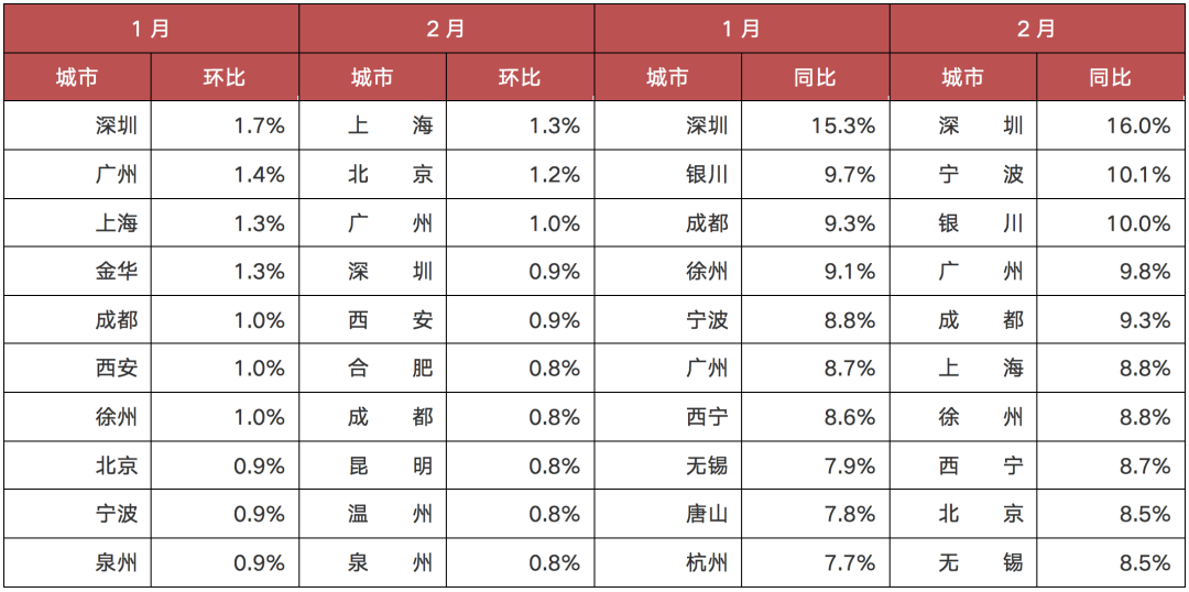 具體城市而言,我們通過對70個重點城市自去年2月以來的新房、二手房房價走勢進行梳理發現,銀川以14.9%的漲幅領漲新建商品住宅價格,其次為徐州;深圳二手房價漲幅高達16%,排名70城首位,寧波位居第二。