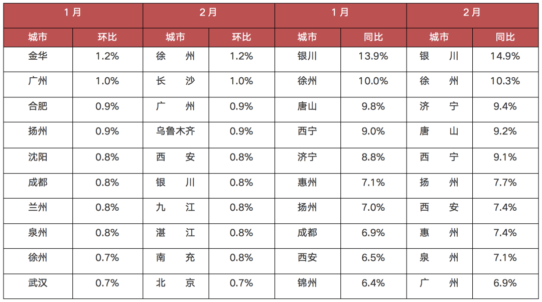 相比之下,仍有部分城市新房二手房價格較去年2月同比下降。其中新房房價同比下跌的城市有6個,北海以4.2%的跌幅領跌70城;二手房房價下跌的城市相對較多,數量達到了21個,其中牡丹江同比下降9.9%。