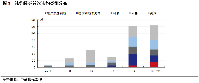 2018-2019年,違約方式與違約原因多樣,除常見的違約因素外還表現出以下新特征。一是股價大跌的質押股權觸及平倉預警線引發(fā)的債務危機;二是私募發(fā)行債券(尤其是私募公司債)、上市公司違約上升明顯;三是觸發(fā)條款加速提前到期導致的集中違約;四是被爆出財務造假問題明顯增多。