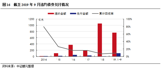 根據已有公開信息,截止2019年9月30日,126家違約主體進行了進行兌付的34家(全額兌付18家,部分兌付的16家),360只違約債券有進行兌付的49只(全額兌付28只,部分兌付20只),累計兌付金額217.01億元(其中累計本金兌付201.62 億元),累計回收率8.65%。隨著剛兌打破以及債券違約的常態(tài)化,違約兌付由2014年的約80%的回收率逐步下降,2018-2019年回收率不足10%。