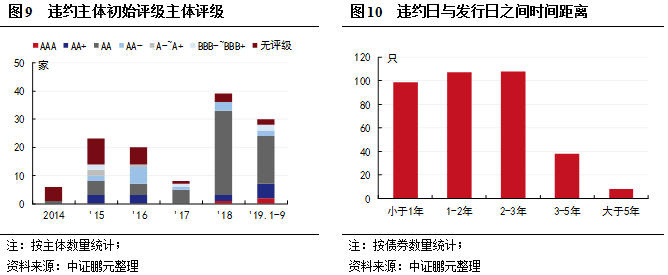 2017年及之前,違約債券發(fā)行時的初始評級大多在AA級(含)以下以及無主體評級的債券,在違約日之前的主體的評級則大多為A+級(含)以下及無主體評級。2018年之后,違約主體的評級開始向高等級擴散,2018年-2019年9月,有3家初始評級為AAA的主體違約,2019年1-9月初始評級AA+級以上違約主體的占比甚至達到了23%。