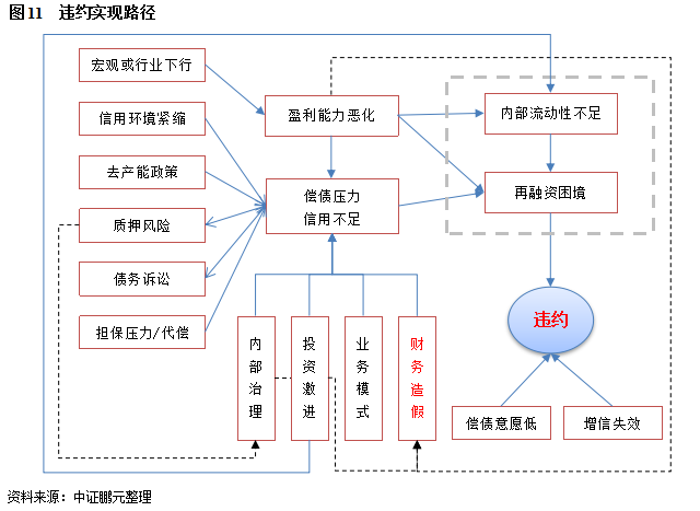惡意違約和增信失效直接導致違約。惡意違約的企業(yè)通常伴隨虛假財務信息、資產轉移、股權套現等行為。一旦相關違法違規(guī)的負面信息被挖掘,引發(fā)企業(yè)負面形象、司法訴訟、資產或股權凍結、銀行抽貸等,最終企業(yè)資金鏈斷裂。增信措施是債券本息償付的最后防線,但抵質押瑕疵、擔保人拒絕代償或償債能力也弱的情況下,增信措施也形同虛設。