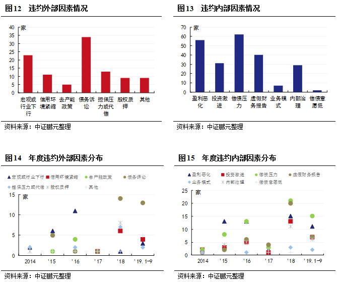 債券違約原因表現:整體而言,債務訴訟、宏觀或行業(yè)因素下行是導致違約的主要外部因素,盈利惡化、償債壓力、財務造假、投資激進是導致違約的主要內部因素。分階段看,外部因素上,2014-2016年,宏觀或行業(yè)下行帶來的盈利惡化是違約的主要因素,2017年-2019年9月債務訴訟帶來的賬戶或股權凍結、資產查封成為主要因素,2018年-2019年9月還表現出信用環(huán)境緊縮、股權質押平倉風險引發(fā)違約的特殊特征。內部因素上,償債壓力和盈利惡化一直是最主要的違約因素,投資激進和財務造假在2018年尤為凸顯。