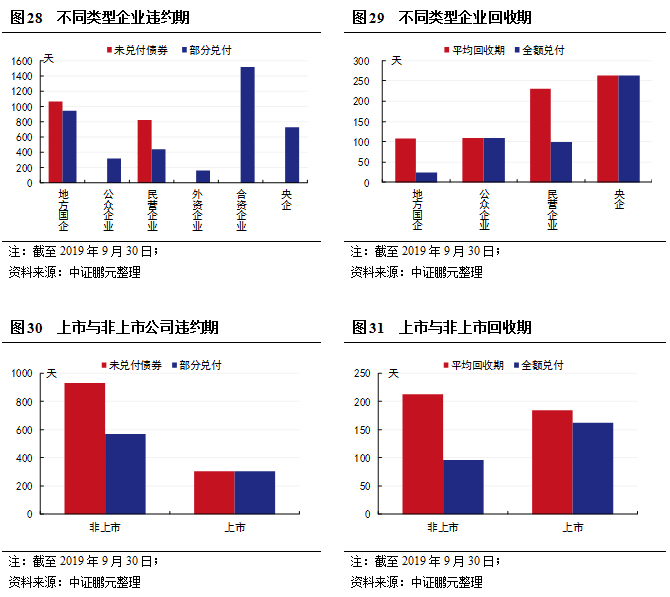 從企業(yè)類型來看,未兌付債券中地方國有企業(yè)的平均違約期最長,約2.93年;部分兌付債券中,合資企業(yè)的平均違約期長達4.14年;外資企業(yè)的平均違約期最短,為163天,其次是公眾企業(yè)平均違約期約為0.83年。綜合來看,民企的平均違約期在1.26年,其未兌付的債券違約期明顯高于其部分兌付的違約債券。無論部分兌付或未兌付,非上市公司的平均違約期均大于上市公司,非上市未兌付違約債券平均違約期2.55年,部分兌付違約債券平均違約期1.55年;上市公司平均違約期0.83年。